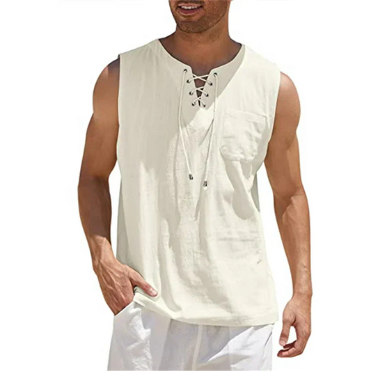 Momount Men Linen Tank Top – Lace Up V Neck Sleeveless Beach Casual